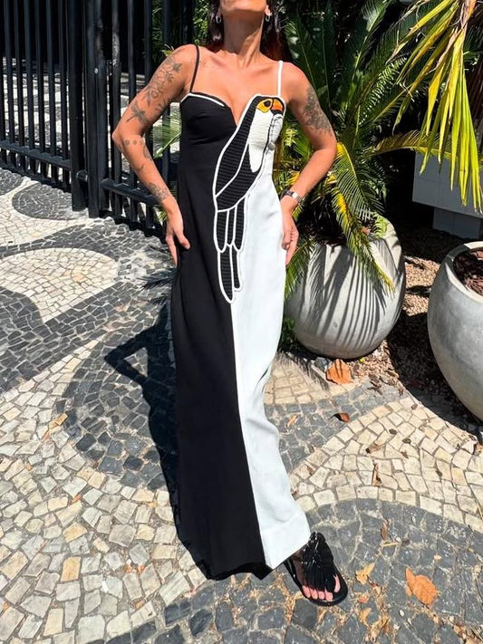 Women Colorblock Maxi Dress with Parrot Embroidery | Caressa