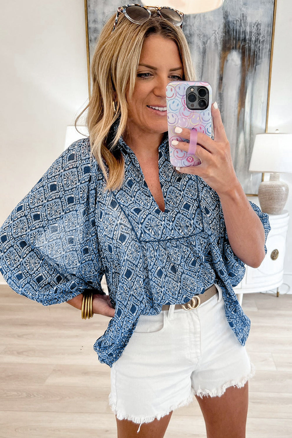 The Women Geometric Print Loose Blouse | Avalora offers a lightweight layer with standout visual appeal. Featuring a structured V-neck and long balloon sleeves with gathered cuffs, this piece balances Western-inspired motifs with everyday usability. The airy silhouette provides flexibility for casual styling or dressed-up layering.