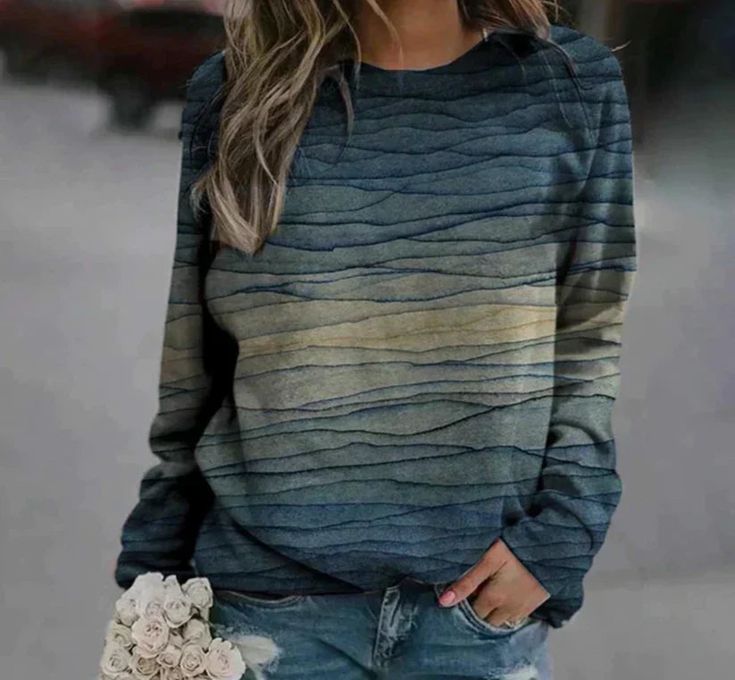 The Women Abstract Print Knit Sweater | Jesse blends creative expression with timeless comfort. Its bold abstract pattern mimics nature-inspired gradients, offering visual depth and versatility. With a relaxed fit and breathable knit texture, this piece is a standout essential for any casual or creative wardrobe.