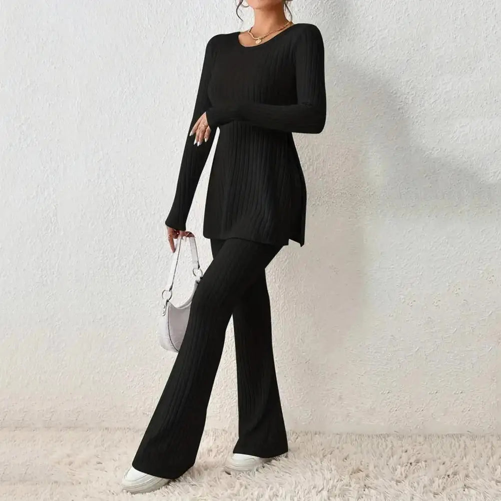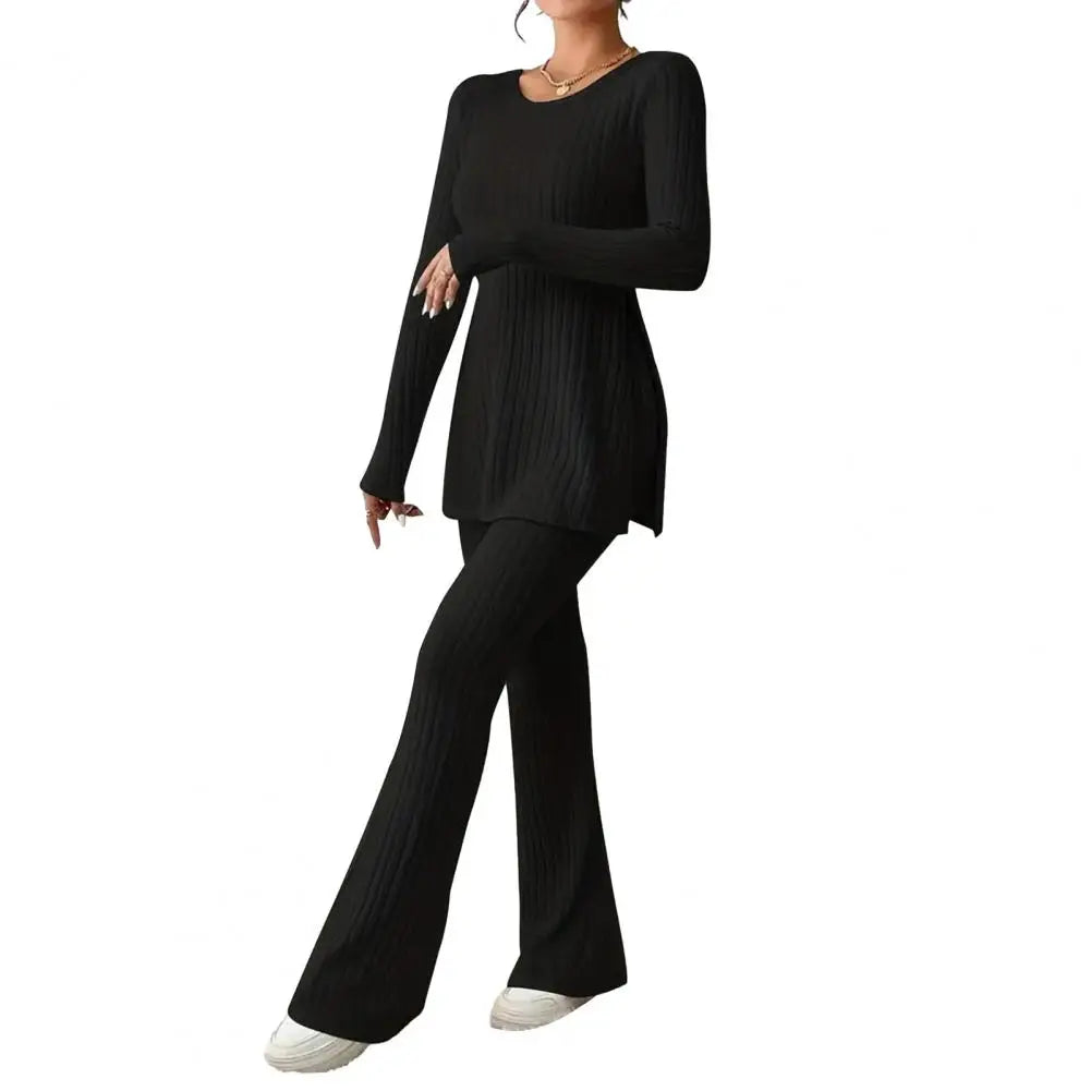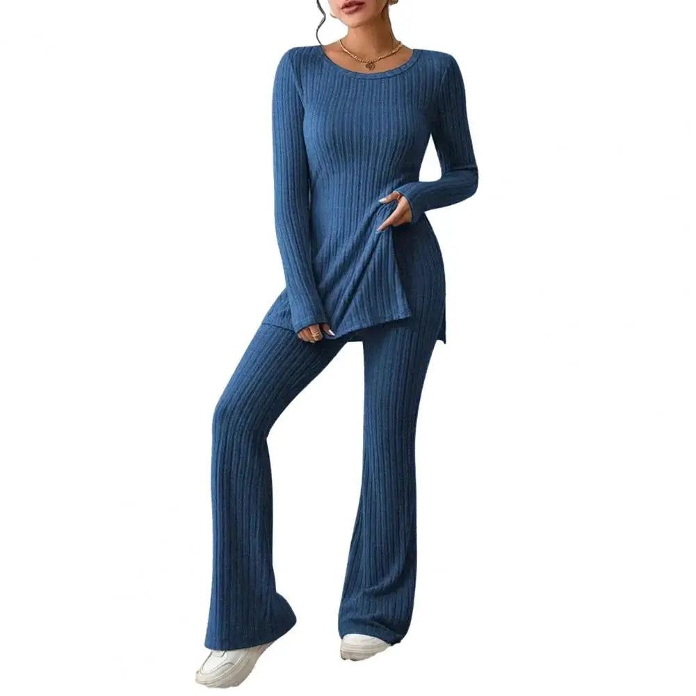 A relaxed and cozy ribbed lounge set for women, perfect for casual outings or lounging in comfort and style.