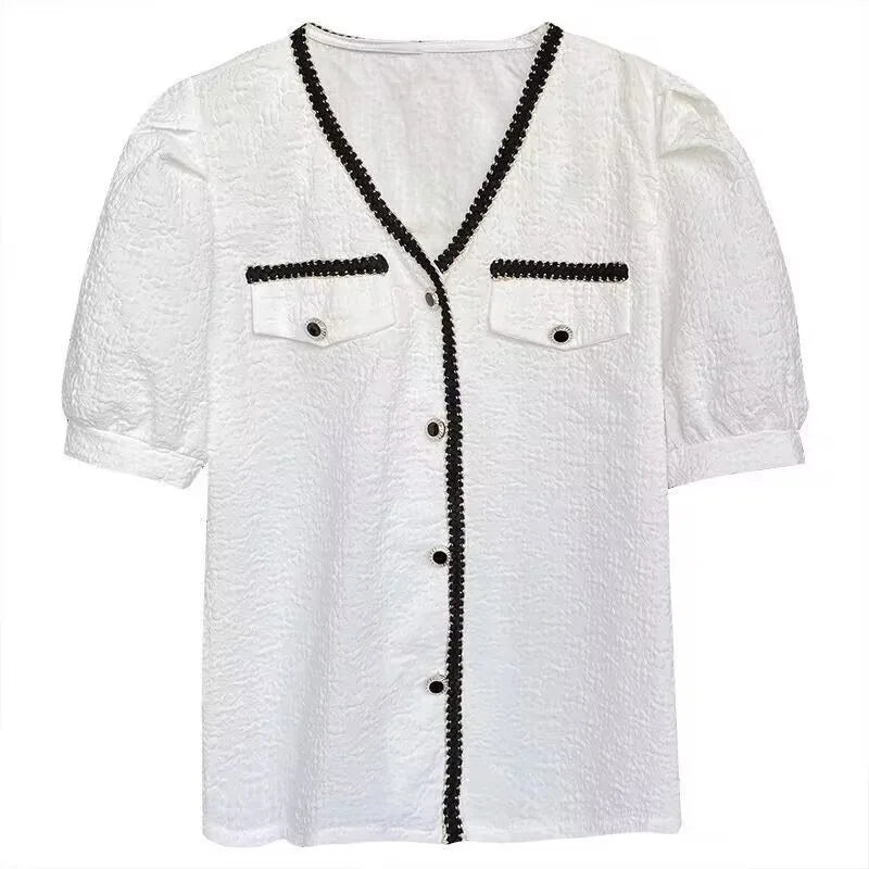 The Chic Puff Sleeve Blouse | Azucena brings an exquisite touch of sophistication to your outfit. Featuring a textured finish and contrasting details, this blouse elevates your style effortlessly. Its puff sleeves and V-neck design enhance femininity, making it ideal for casual gatherings, office wear, or special occasions.