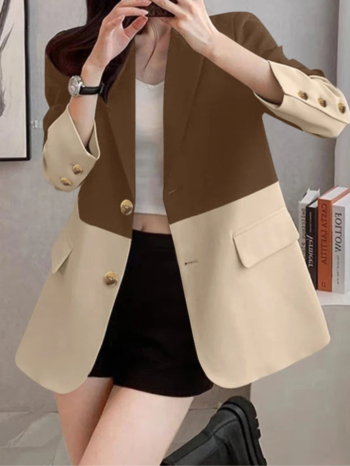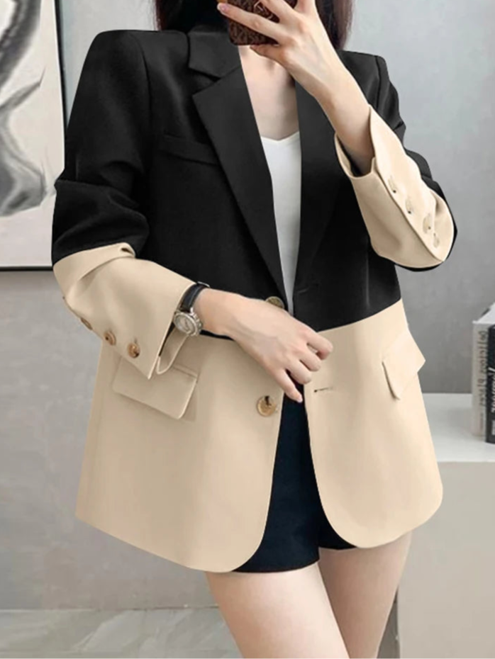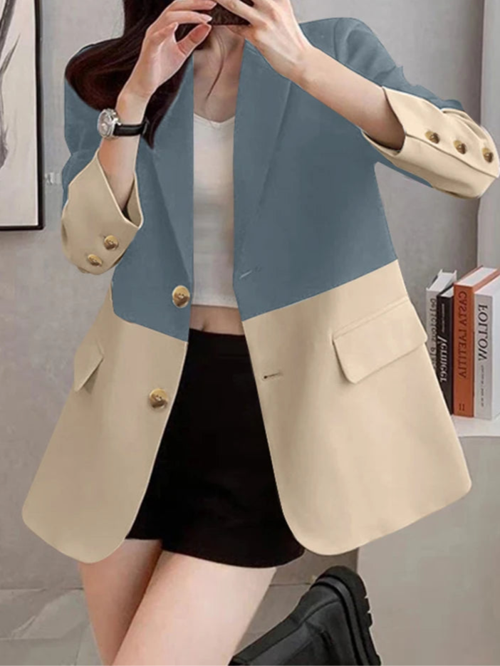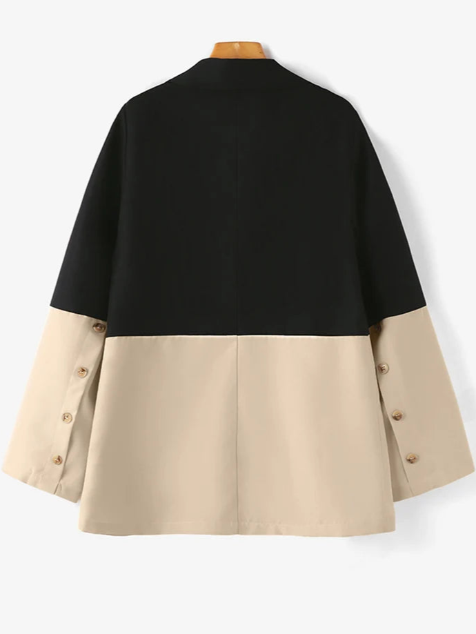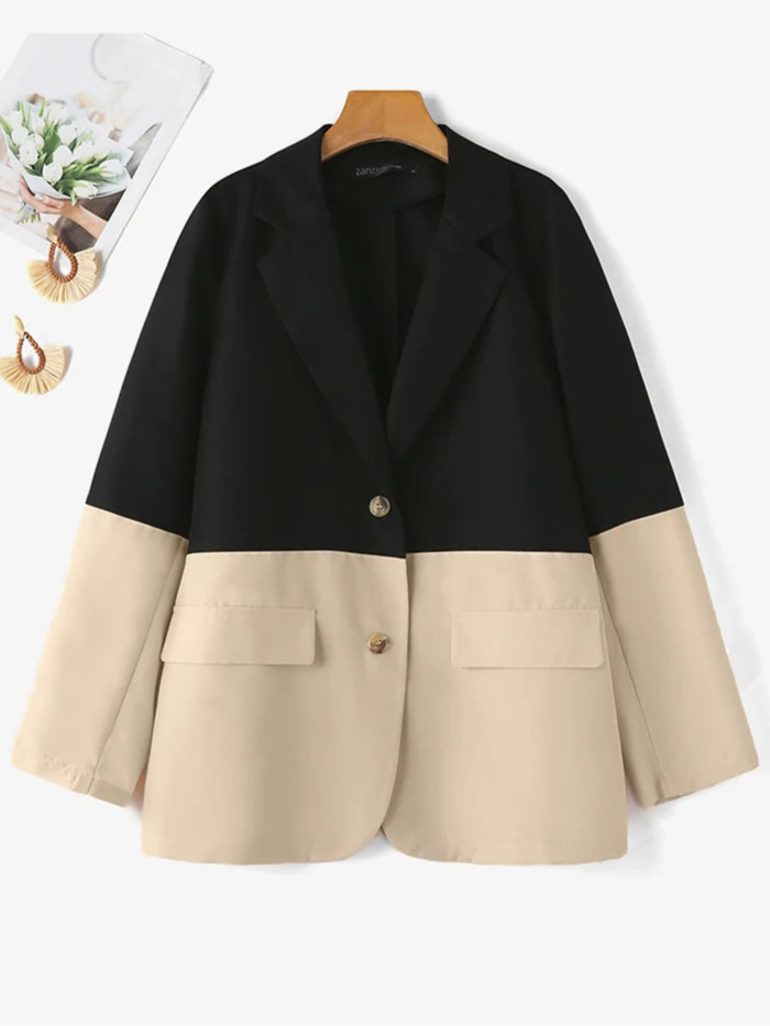 The Two-Tone Oversized Blazer | Everilda redefines power dressing with its striking color-block design and relaxed tailored fit. Featuring structured shoulders, gold button details, and a classic lapel collar, this blazer effortlessly combines sophistication with contemporary style. The oversized fit ensures comfort and versatility, making it perfect for both professional and casual occasions.