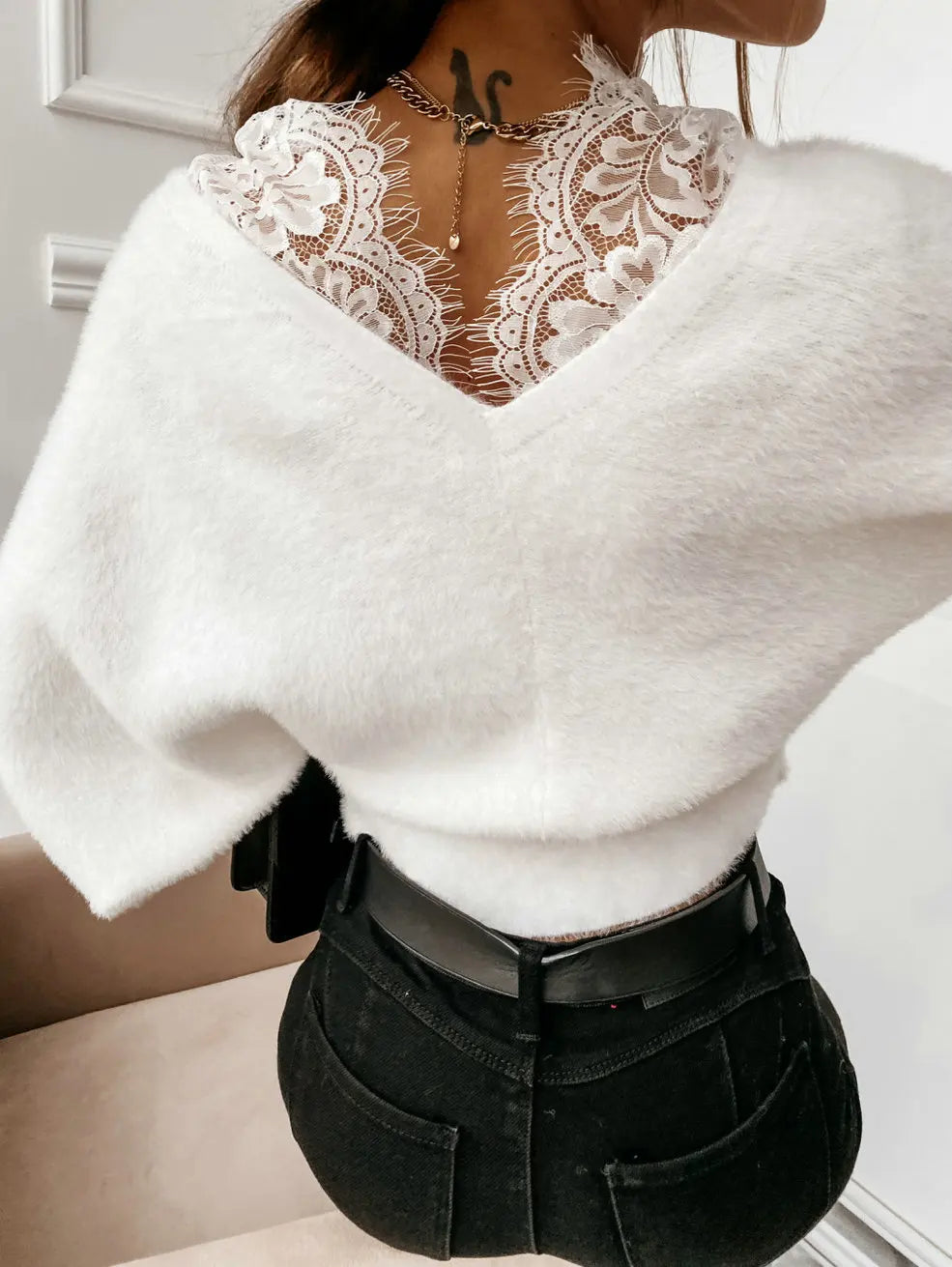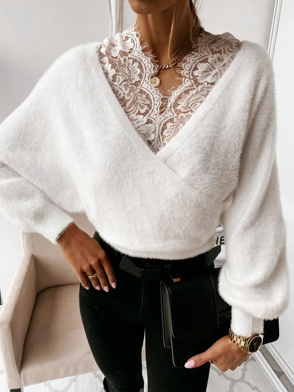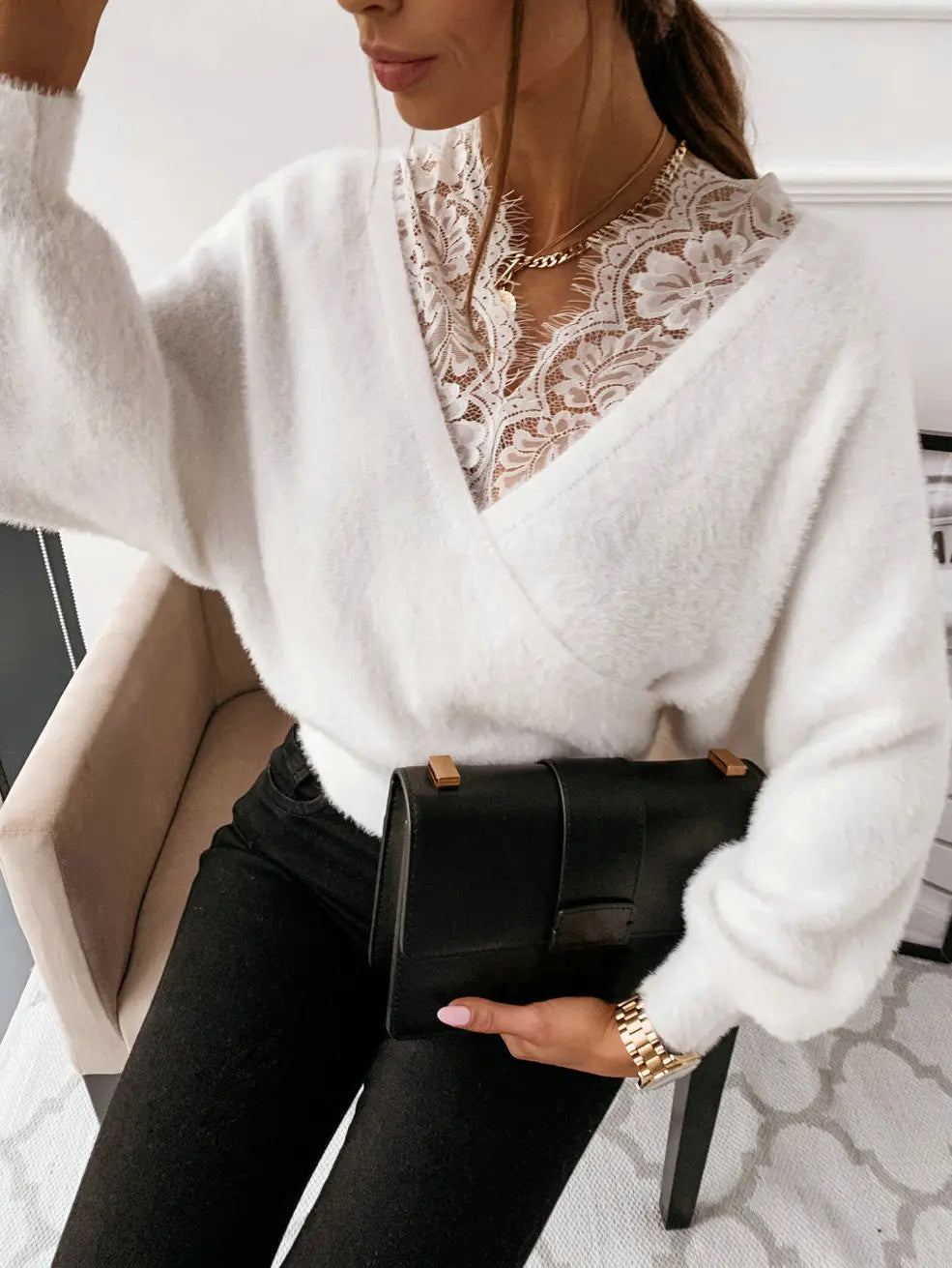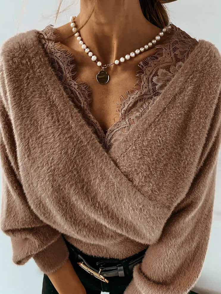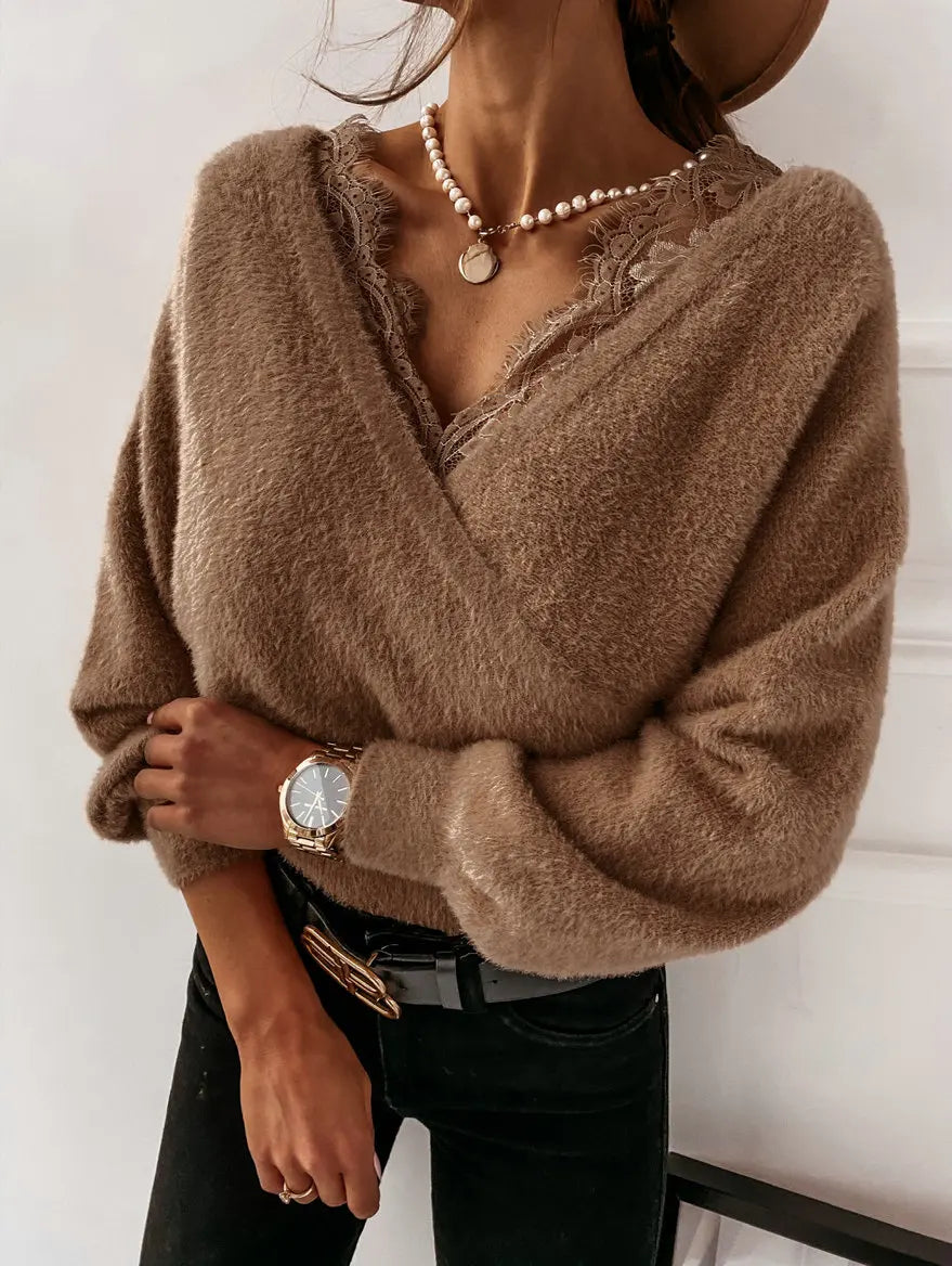 A cozy yet elegant sweater with delicate lace trim and a flattering V-neckline.
