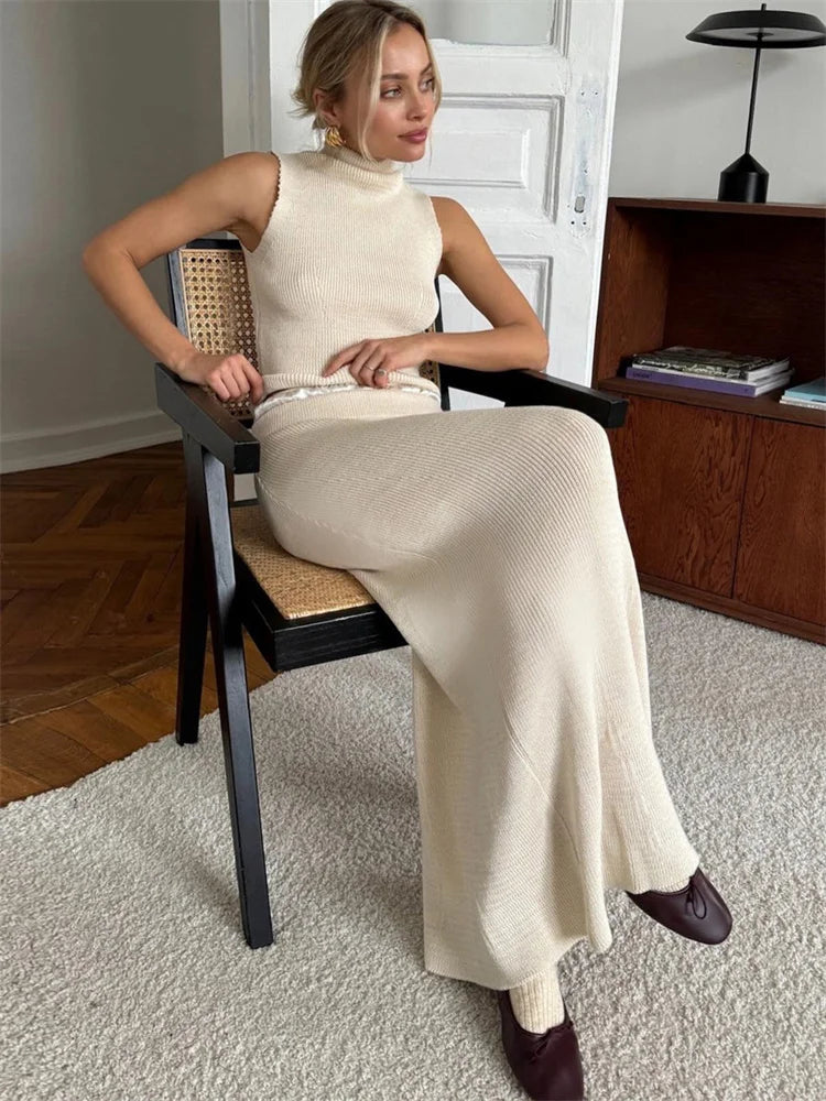The Sleeveless Knit Two-Piece Set | Melvina combines timeless style with cozy comfort. This set includes a sleek sleeveless top and a flowy maxi skirt, both crafted from soft knit fabric. Designed to flatter with its effortless fit, it's perfect for a chic yet comfortable look, whether lounging at home or stepping out in style.