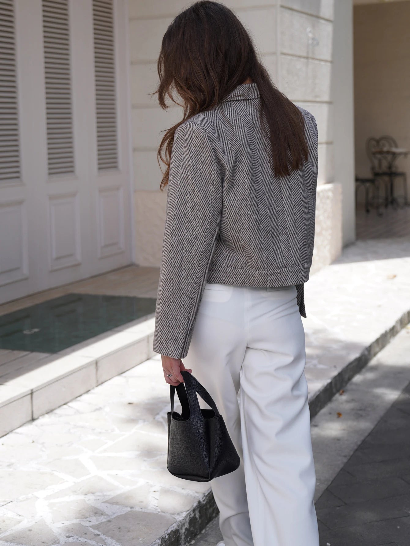 A tailored cropped blazer with a timeless herringbone pattern, perfect for modern sophistication.
