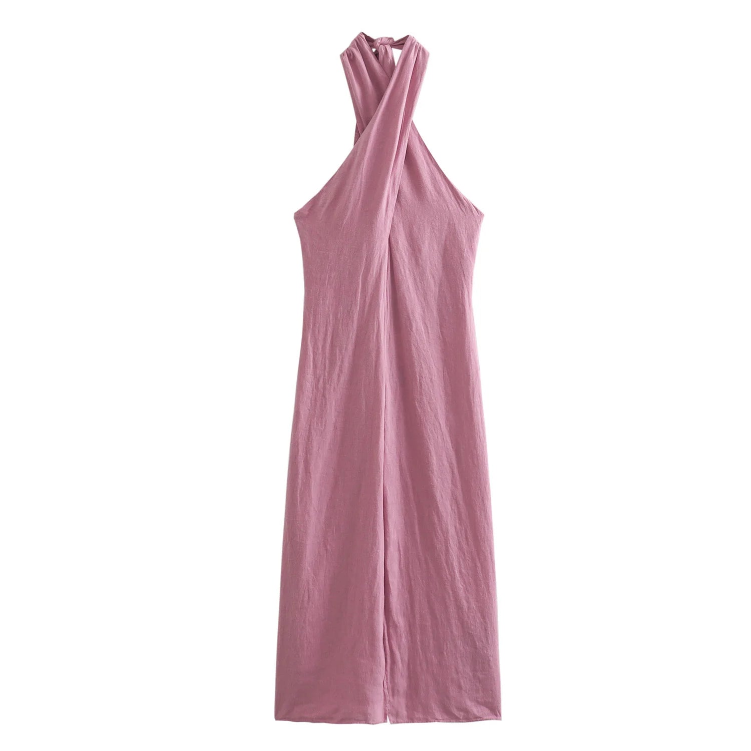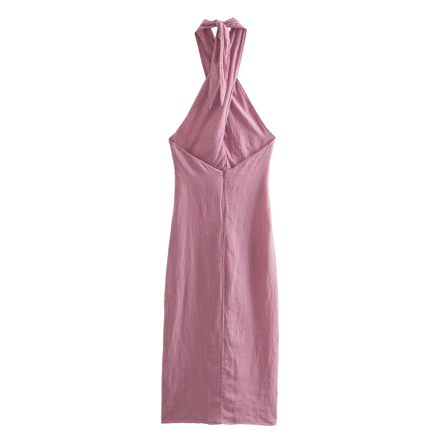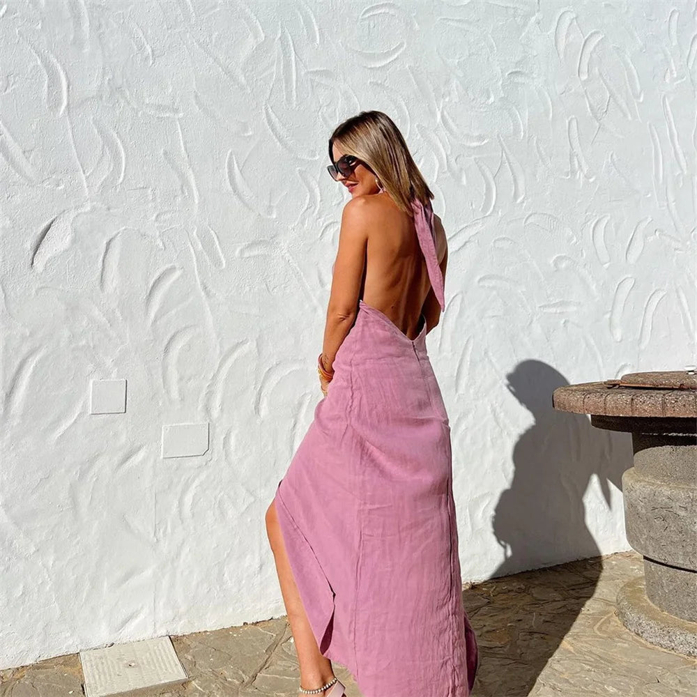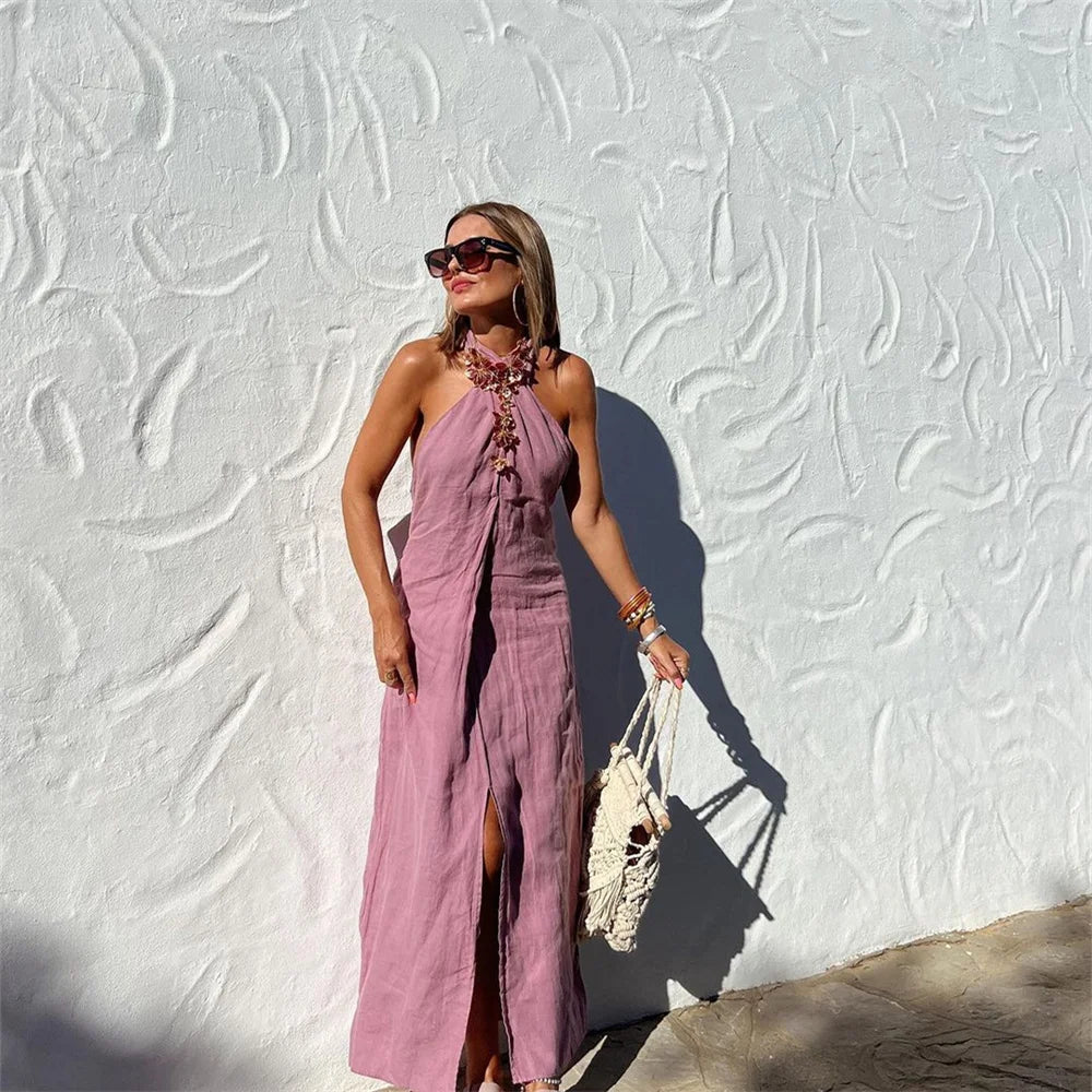 The Halter-Neck Maxi Dress with Side Slit | Odelia brings effortless elegance to your wardrobe. This dress features a trendy halter-neck design, a breezy side slit, and a flowy silhouette that makes it perfect for summer outings or beach vacations. Crafted from lightweight polyester, it offers comfort and style in equal measure.